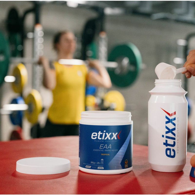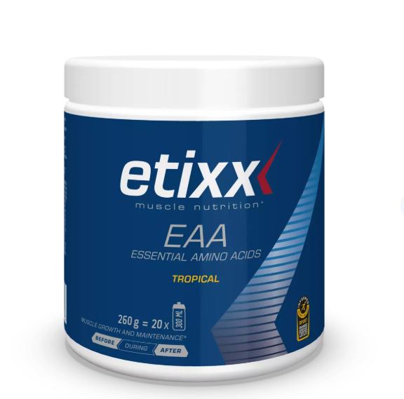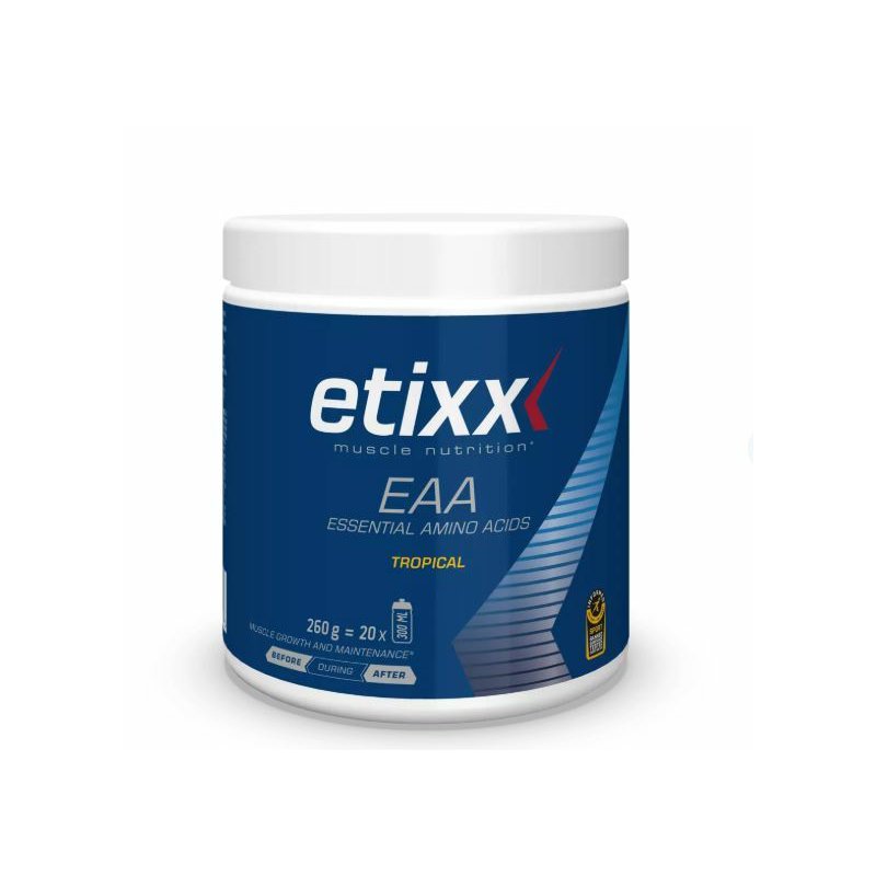 Studie ukazují, že EAA mají nejsilnější vliv na syntézu svalových bílkovin (budování svalů). Nápoj Etixx EAA je veganský nápoj s nízkým obsahem cukru a tuku s příchutí tropického ovoce. Tento nápoj obsahuje až 10 g esenciálních aminokyselin na porci, včetně 6 g BCAA v poměru 2:1:1. Dávka 10 g EAA je dostačující k maximalizaci budování svalů.