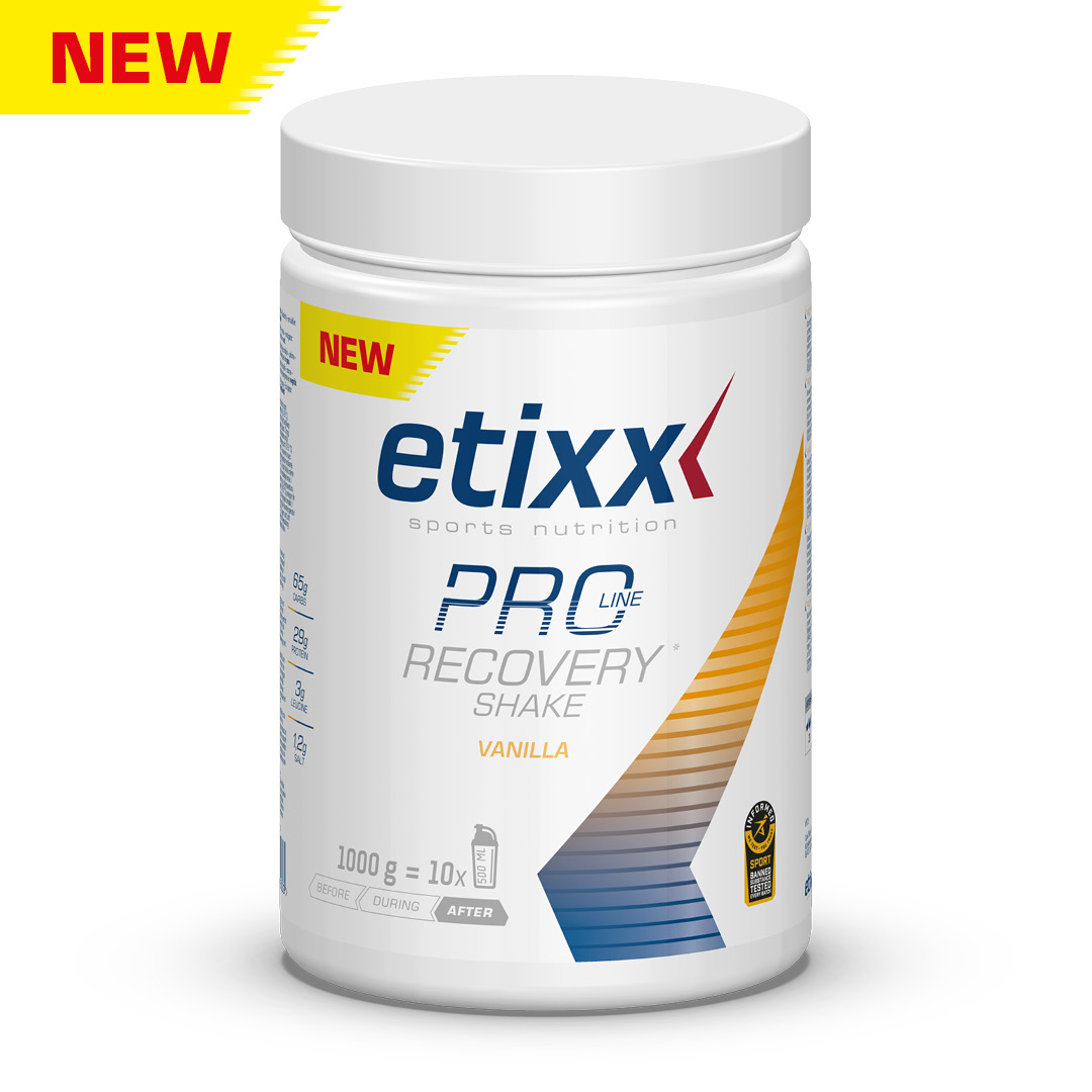PRO LINE Recovery Shake, směs sacharidů s vysokým obsahem (±60 g), izolátu syrovátkového proteinu (±30 g) a leucinu (3 g), byl sestaven na základě nejnovějších vědeckých poznatků. Tento profesionální koktejl navíc obsahuje také 1,2 g soli na porci s cílem doplnit elektrolyty (soli) ztracené potem a urychlit a optimalizovat rehydrataci.