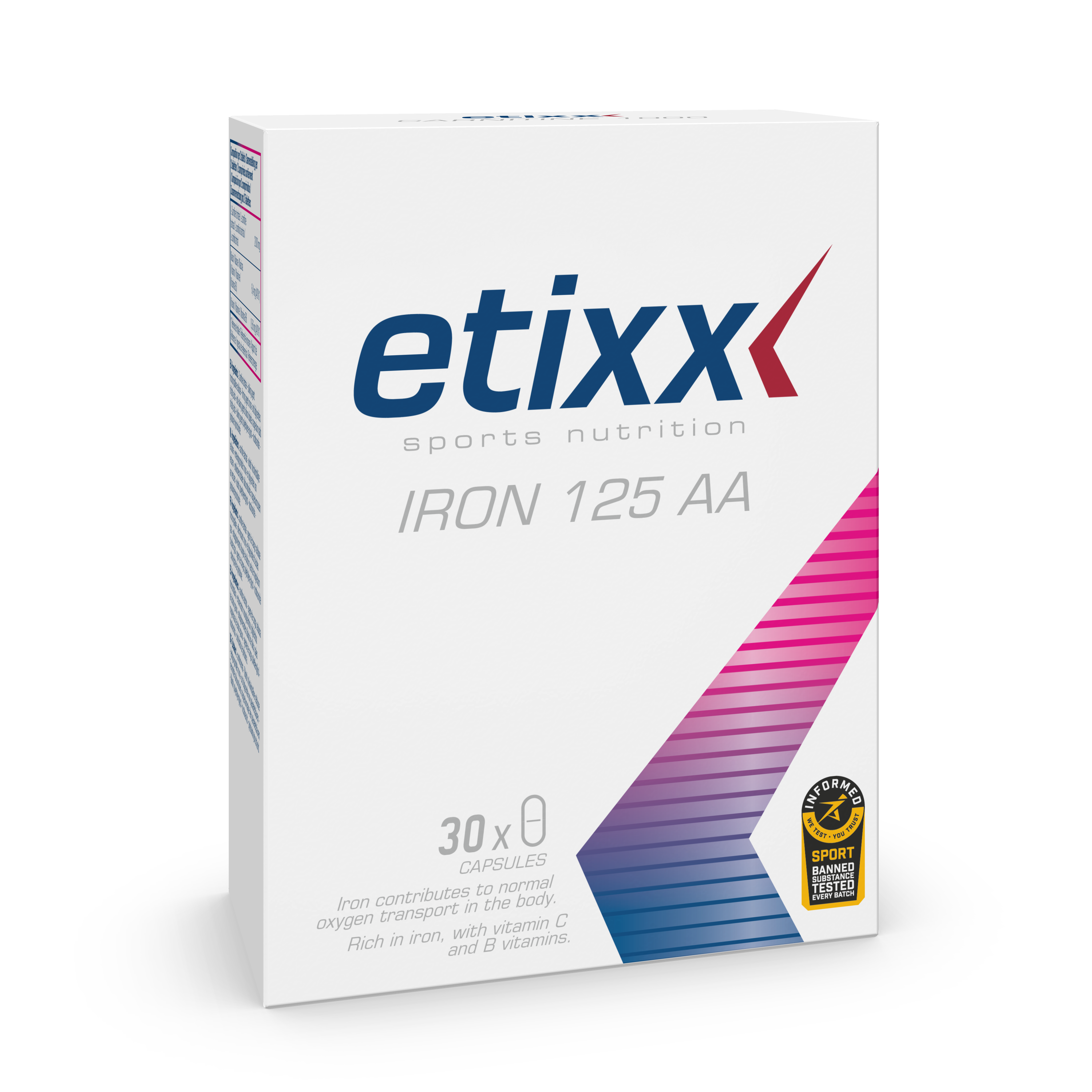 Vzhledem k tomu, že železo je pro fungování svalů během cvičení tak důležité, sportovci by měli zvážit užívání přípravku Etixx Iron 125 AA. To může být obzvláště prospěšné při tréninku ve výšce pro optimalizaci tvorby červených krvinek. Železo se snadněji vstřebává v kombinaci s vitamínem C a hůře v kombinaci s kofeinem nebo produkty bohatými na vápník. Etixx Iron 125AA obsahuje přidaný vitamín C, vitamín B2 a vitamín B6, které všechny přispívají ke snížení únavy a vyčerpání, a také vitamín B12 pro podporu přirozené tvorby energie a tvorby červených krvinek. Přidaný mangan přispívá k ochraně buněk před oxidačním stresem a pomáhá s normálním energetickým metabolismem.